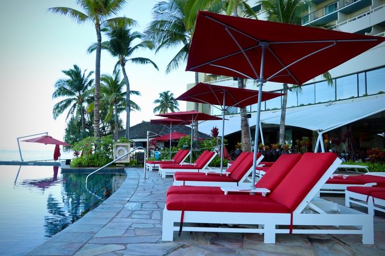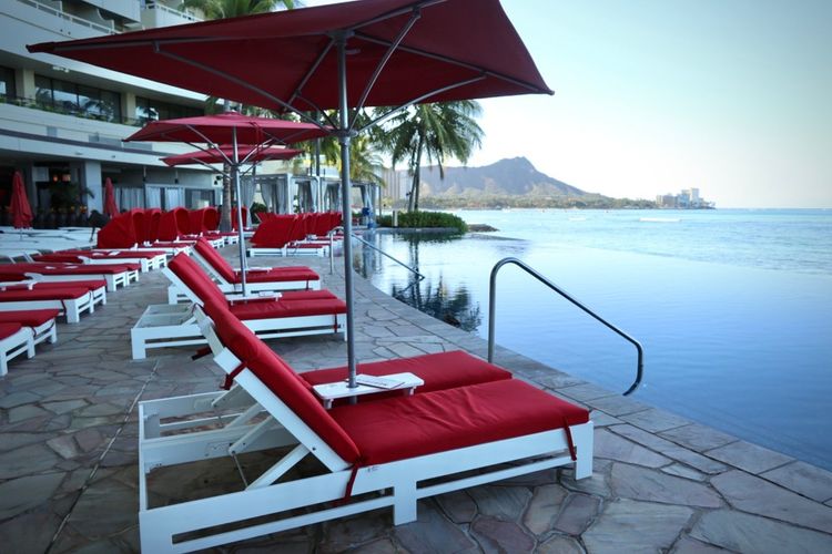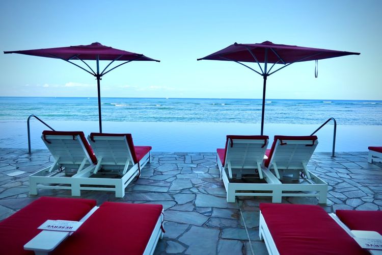 シェラトンワイキキの大人専用プール、エッジ・インフィニティプールの最前列にあるエッジ・ラグジュアリー チェイス ラウンジセット。 傘と2脚のラウンジチェアのセットです。 ご利用対象:シェラトンワイキキご宿泊のお客様で、16歳以上の方のみご利用いただけます。
