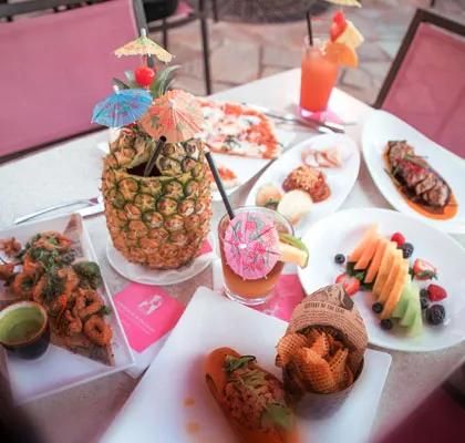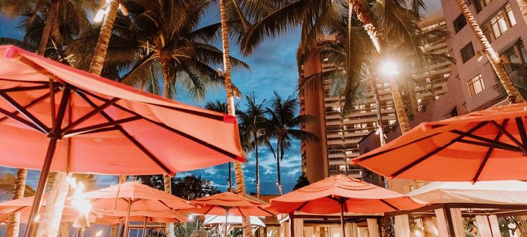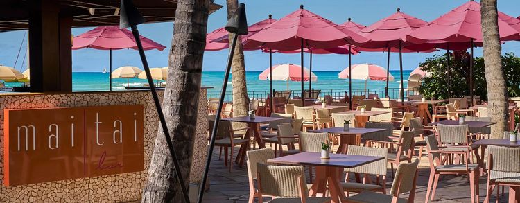 「太平洋のピンクパレス」ロイヤル・ハワイアン・ホテルのビーチ沿いに佇む、世界的に有名なマイタイ バー。ダイヤモンドヘッドと海を望む絶景のオープンエア席で、名物「ロイヤル・マイタイ」やハワイらしい軽食、パティシエ特製デザートを堪能できます。夕暮れ時には空がピンクやオレンジに染まり、地元ミュージシャンの演奏が旅の時間を彩ります。
